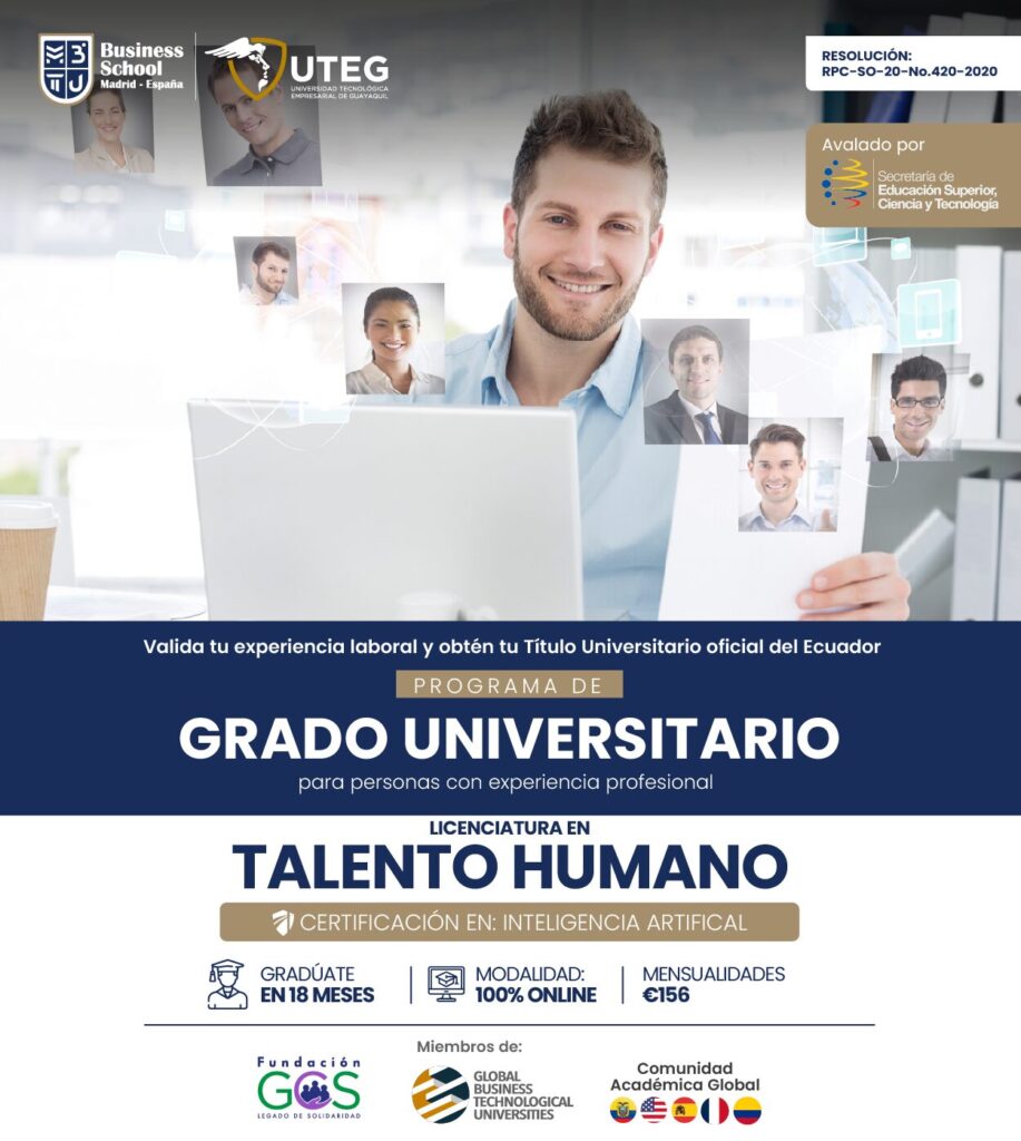 Como Licenciado en Gestión del Talento Humano, serás un profesional competente y exitoso en el mundo corporativo o del emprendimiento. Contarás con todos los conocimientos, las herramientas y las competencias necesarias para planificar y diseñar programas organizacionales que permitan reclutar, contratar y mantener dentro de la organización solo a los mejores. Con un enfoque holístico serás capaz de tomar decisiones basadas en la racionalidad de recursos y el cumplimiento de los objetivos de la empresa. Todo esto con un vasto conocimiento en el manejo de programas informáticos relacionados al área