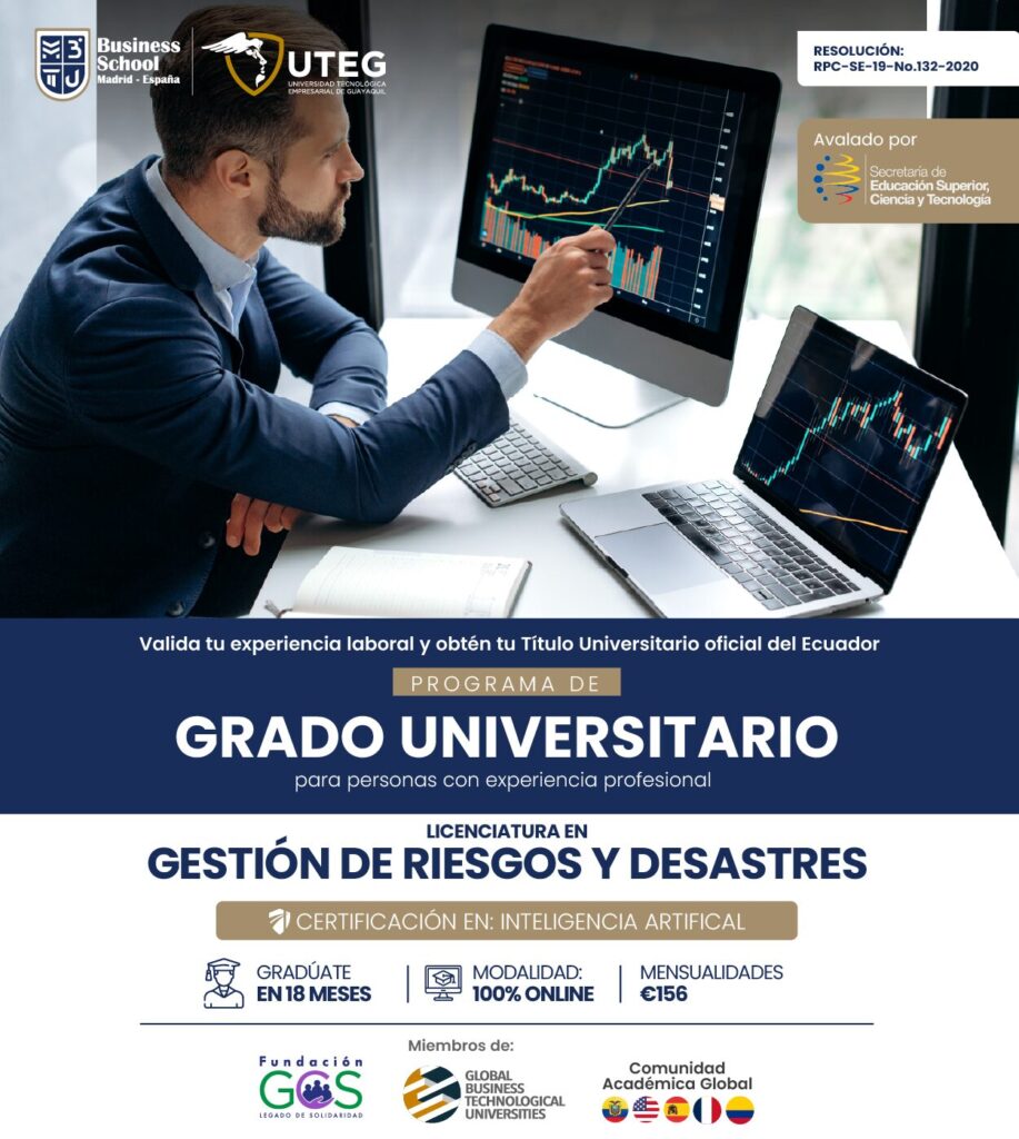 Como Licenciado en Gestión de Riesgos y Desastres, serÔs un profesional competente y exitoso; y contarÔs con todos los conocimientos, herramientas y competencias necesarias para planificar y diseñar programas o proyectos para organizaciones e instituciones privadas o públicas, que permitan analizar, identificar, reducir, prevenir y mitigar la ocurrencia de eventos adversos para salvaguardar la vida humana, los bienes o el medio ambiente. SerÔs capaz de tomar decisiones basadas en la optimización de recursos y el cumplimiento de objetivos planificados, todo esto con un amplio conocimiento en el manejo de programas informÔticos relacionados al Ôrea.